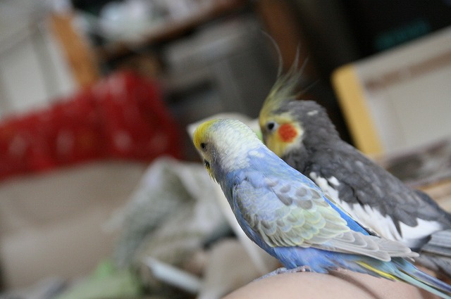 オカメとセキセイ異種でも仲良しですね!