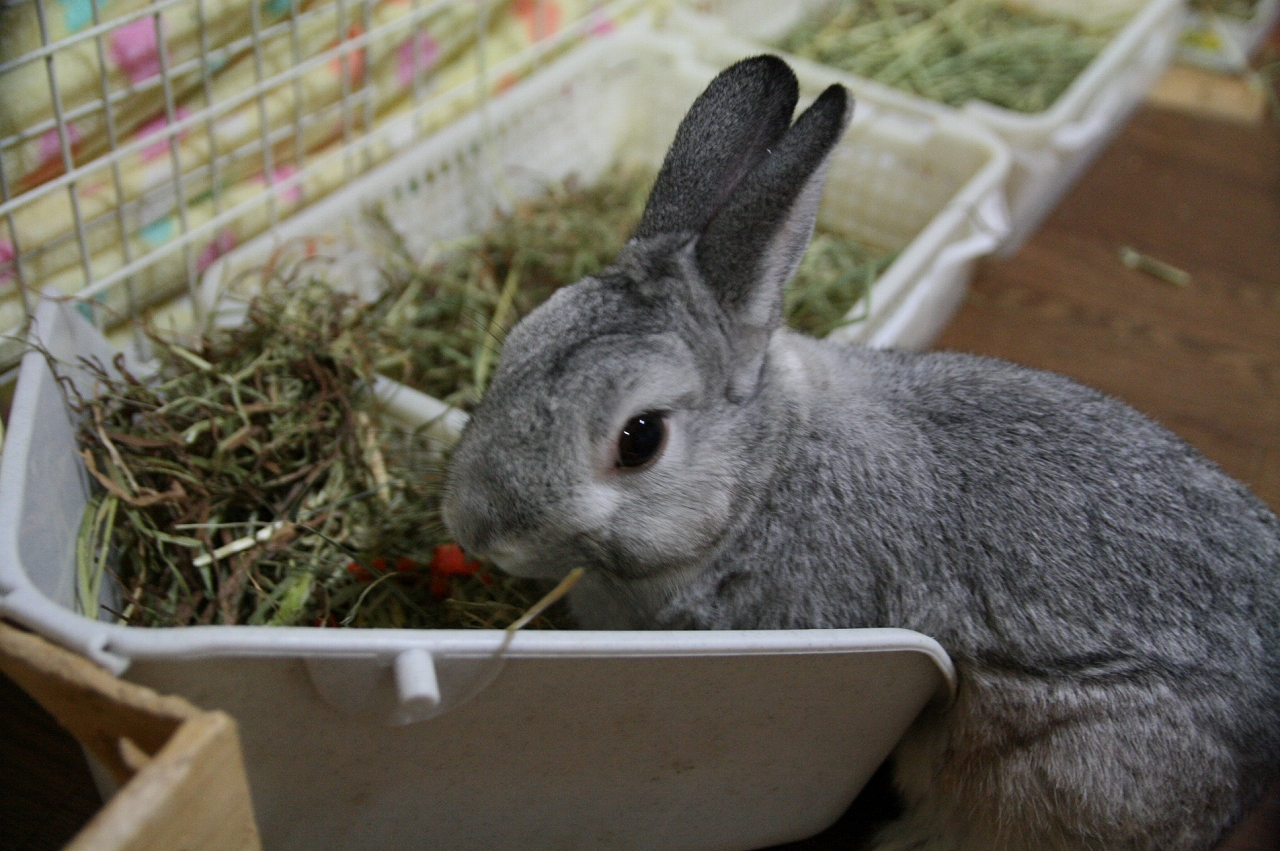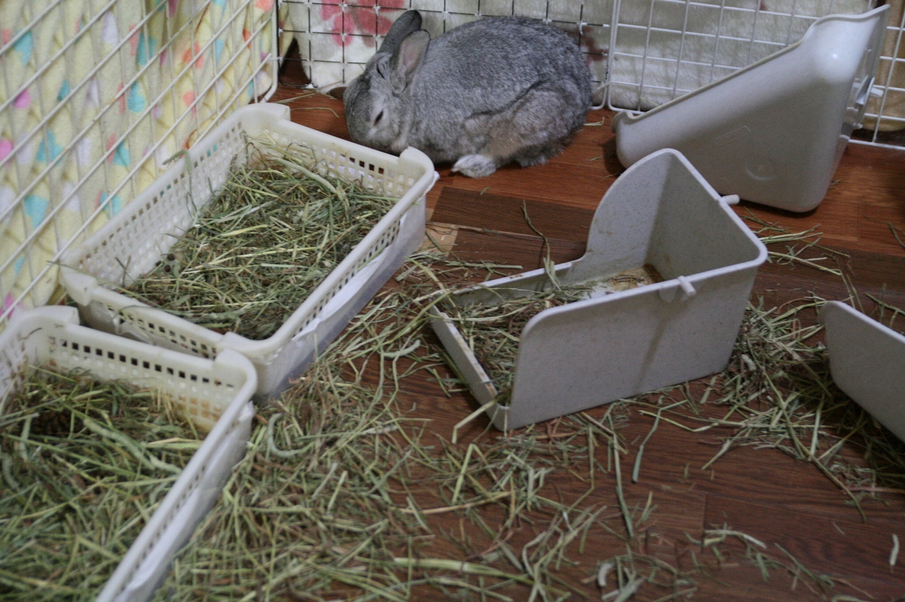 ちらかった牧草で遊ぶのが好きぴょ~。
