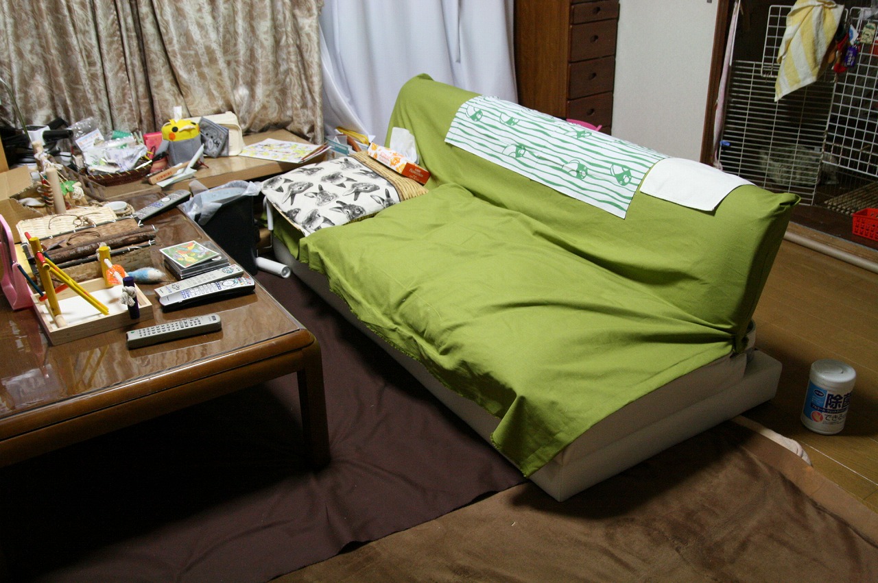 安寿: ソファカバーは、前のピンクの兎さん模様から抹茶色に、