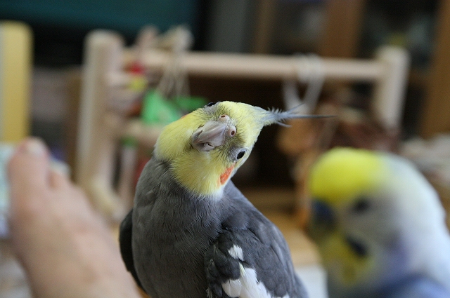 ぎんちゃん; 先回りされても、止まり木まで逃げるぴょ~~。